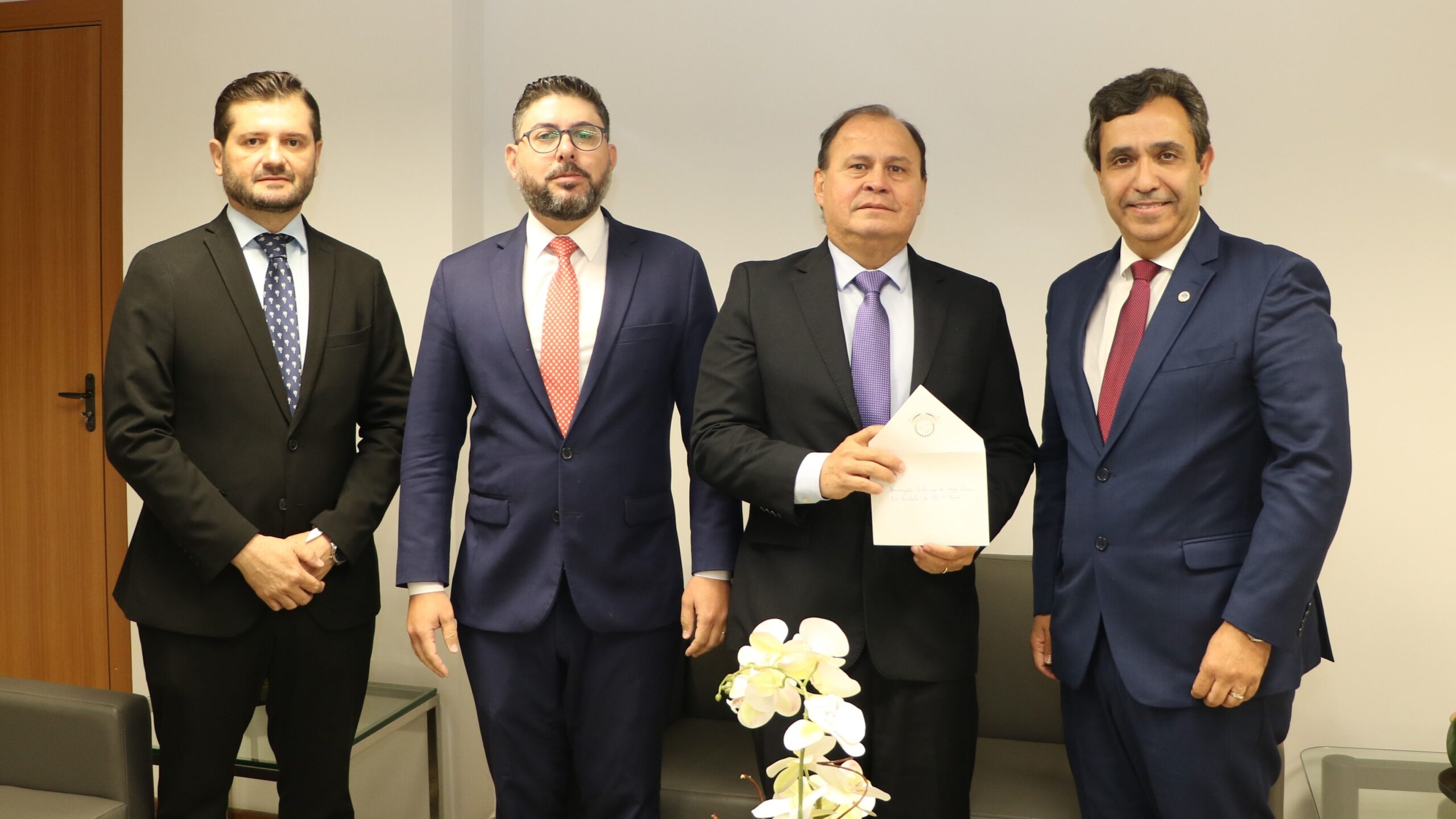 Da esq. para a dir.: juiz federal da 2ª Vara de Ipatinga, Rodrigo Boaventura Martins; diretor da SSJ de Ipatinga, juiz federal José Geraldo Amaral Júnior; presidente do TRF6, desembargador federal Vallisney Oliveira; secretário-geral da Presidência, juiz federal Antônio Francisco do Nascimento