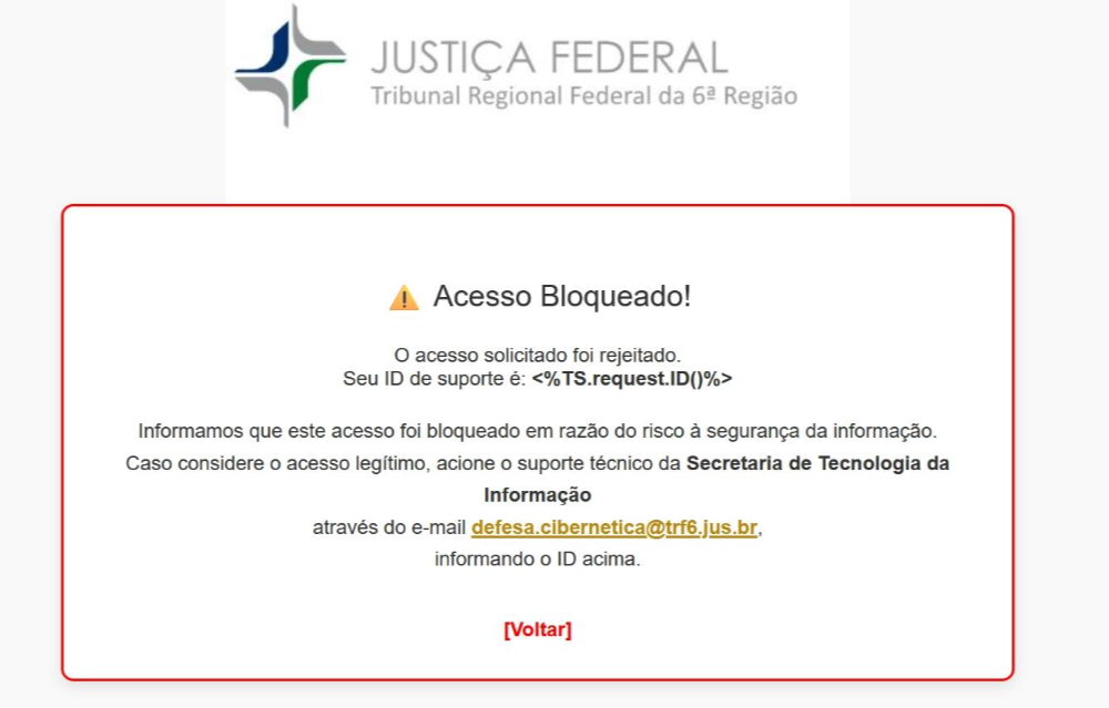 Se o usuário entender que o bloqueio ocorreu de forma indevida — ou seja, que se trata de um acesso legítimo — deverá encaminhar e-mail para defesa.cibernetica@trf6.jus.br, informando: