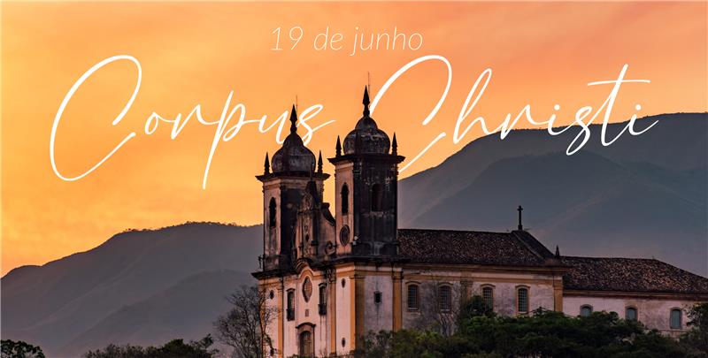 A imagem mostra uma igreja histórica com duas torres, situada diante de uma paisagem montanhosa ao entardecer, com o céu em tons alaranjados e dourados, indicando o pôr do sol. O texto na imagem está em fonte cursiva elegante e diz: "19 de junho Corpus Christi".